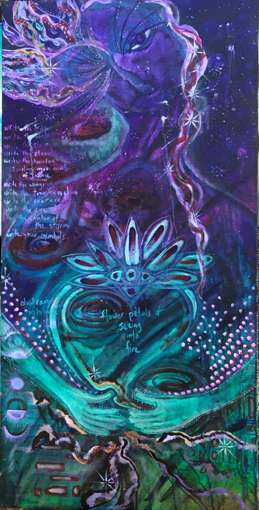 Today, December 28, 2019, the land is mostly cleared of all the debris. One building remains standing of fifteen and there are dreams of creating home there. Much remains uncertain as I wander a bit lost through my days – two of my quilts were rescued and six of my paintings. I am slowly moving towards creating again – two wooden panels wait for me, waiting to be gessoed and filled with the fire of the present moment.