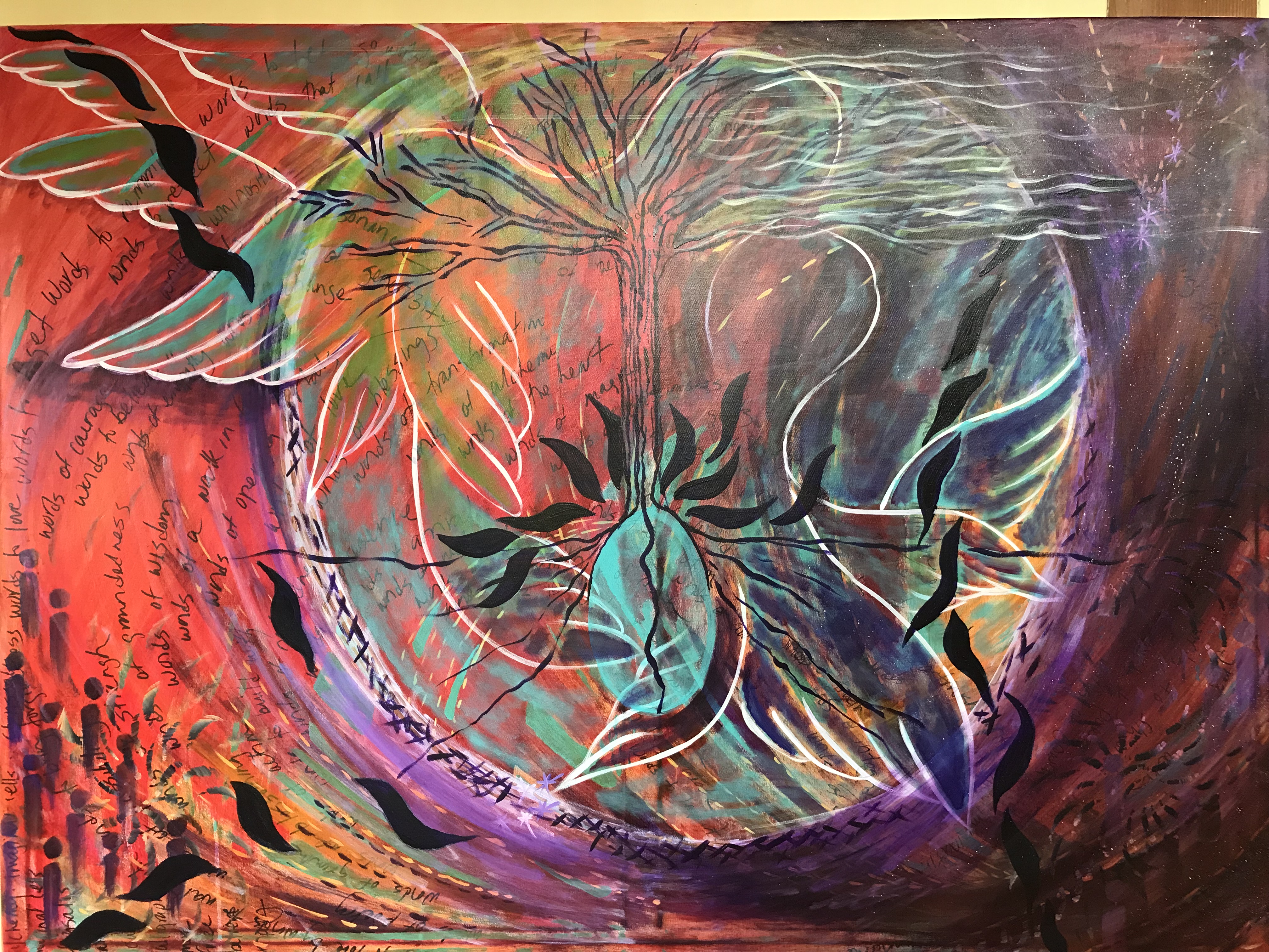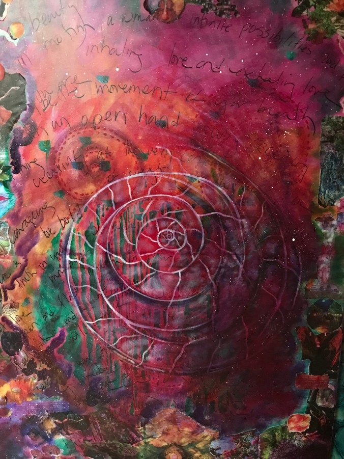 Windswept Courage January, 2018 44X60, acrylic on canvasBirthing Worlds November, 2017 45X60, acrylic on canvasShaman’s Journey: Witness to a New world November, 2018 44X60, acrylic on canvasAt the Center May, 2018 44X60, acrylic on canvas with collage