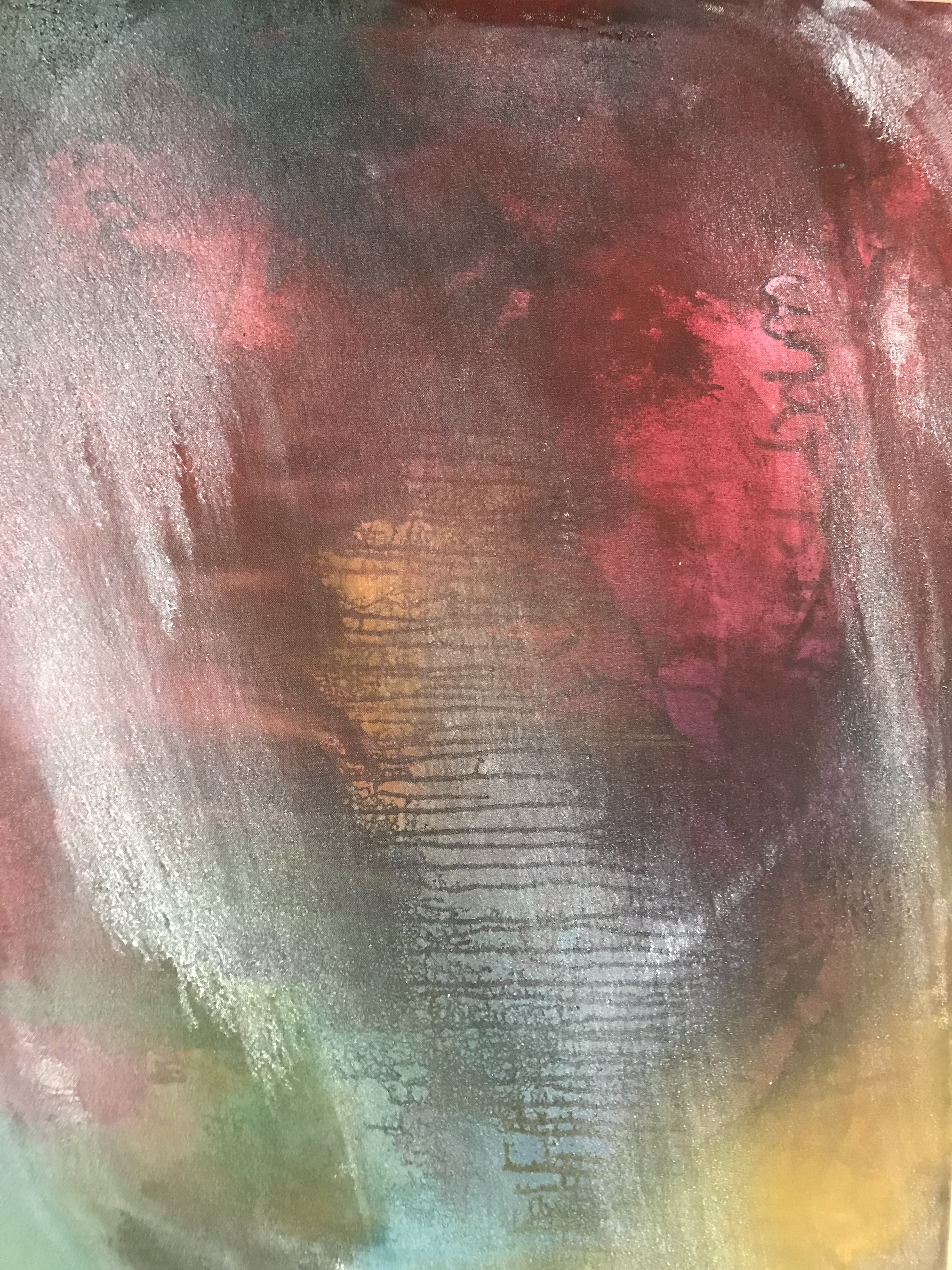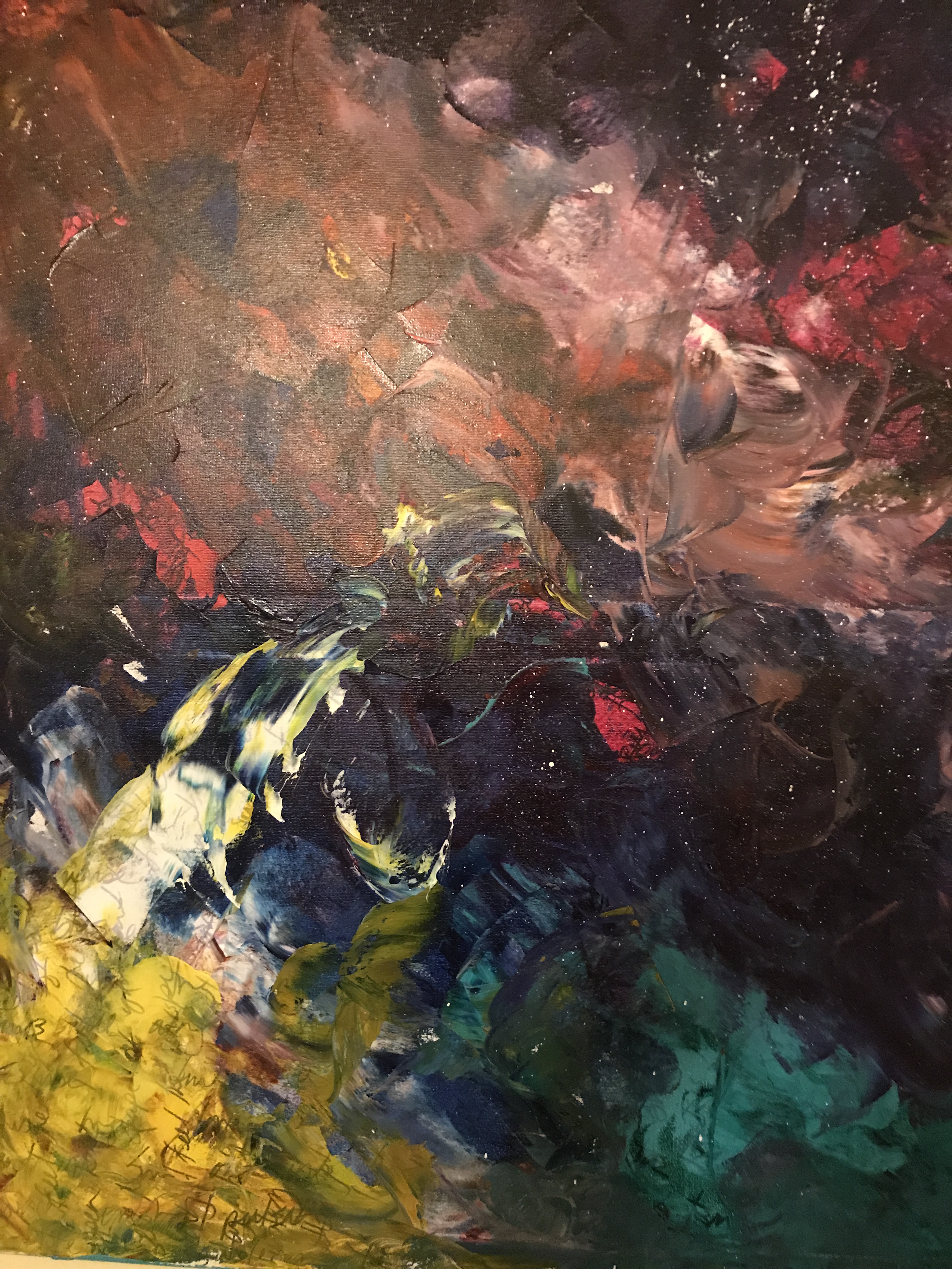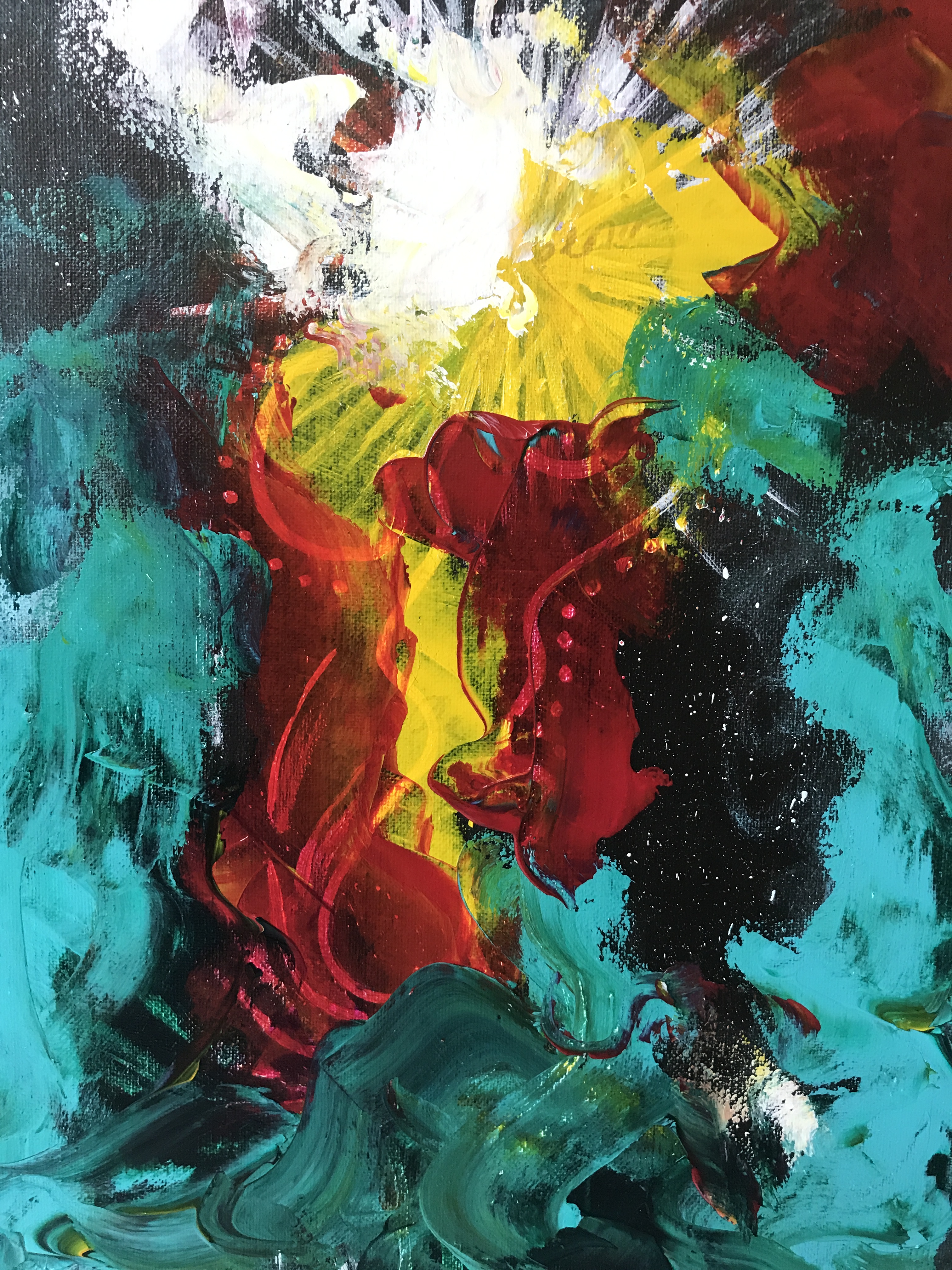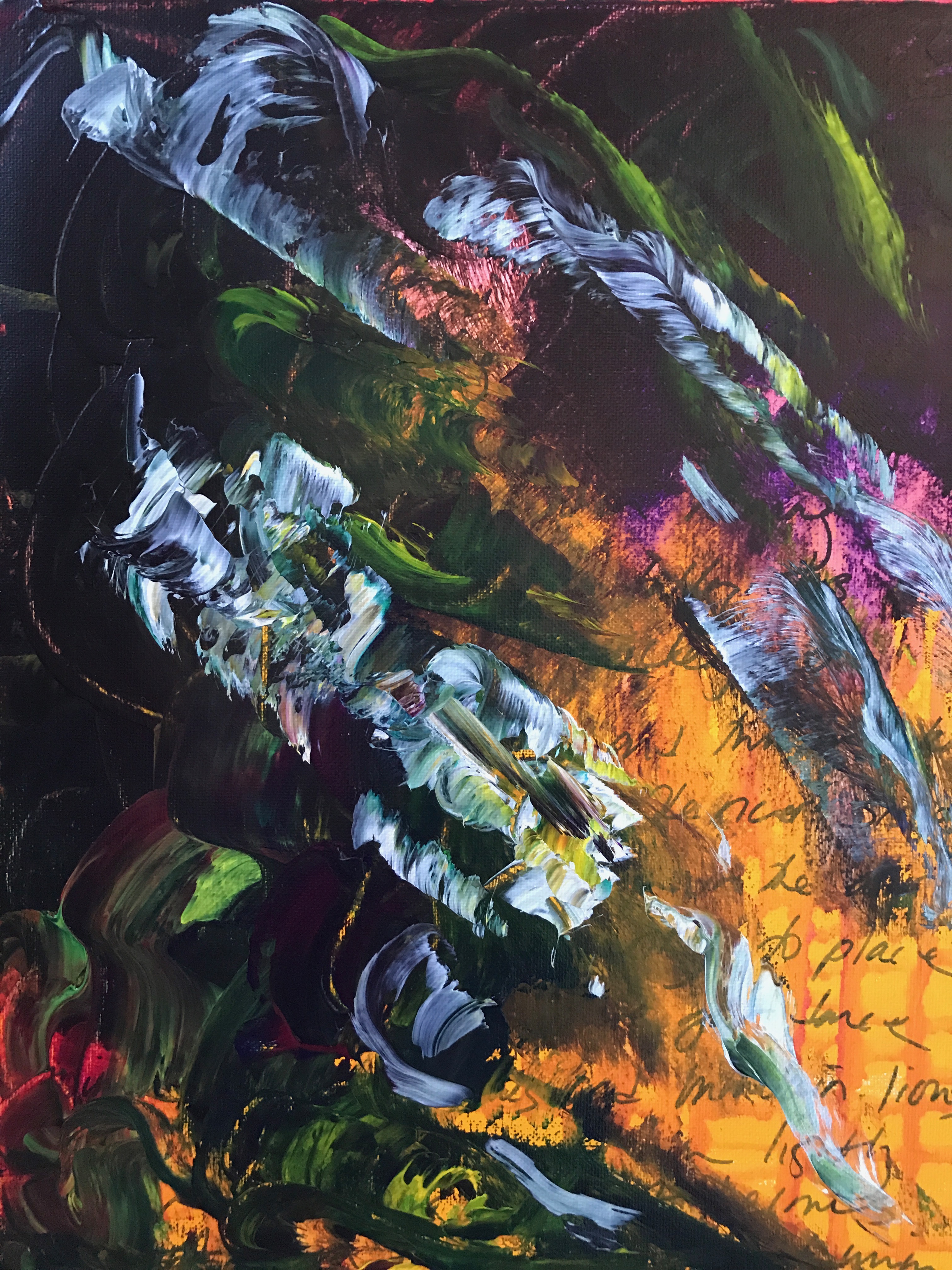 Midnight Eruption March, 2019. 20X24, acrylic on canvasLetters to the Fire:The Blank Rune. December, 2018. 24X30, acrylic on canvasOut of the Chaos. March, 2018. 16X17, acrylic on canvas